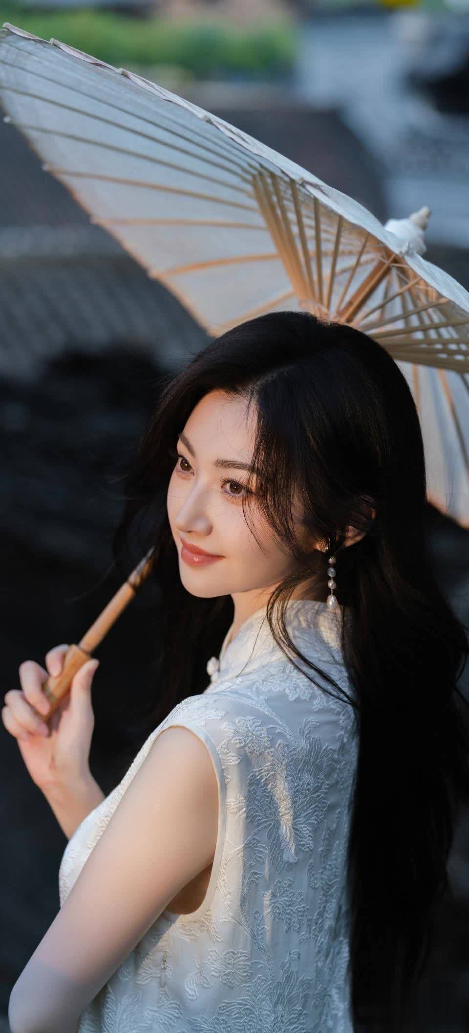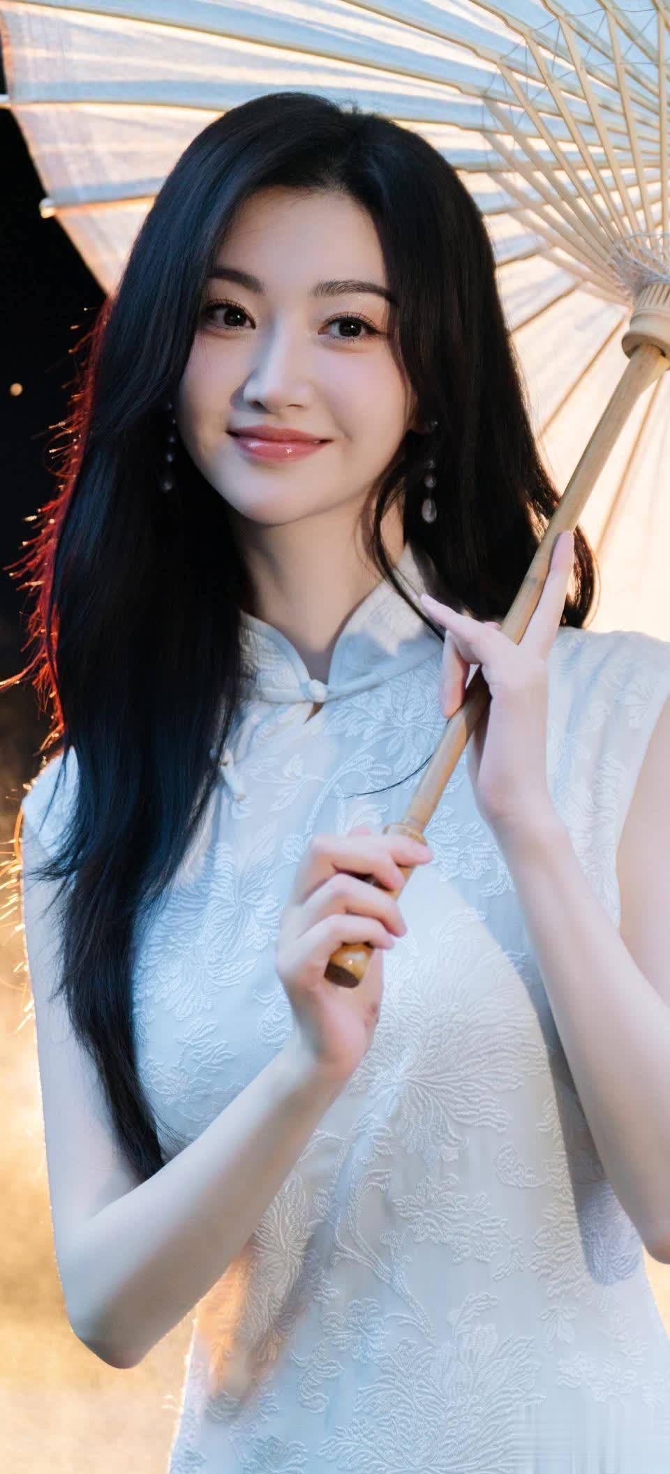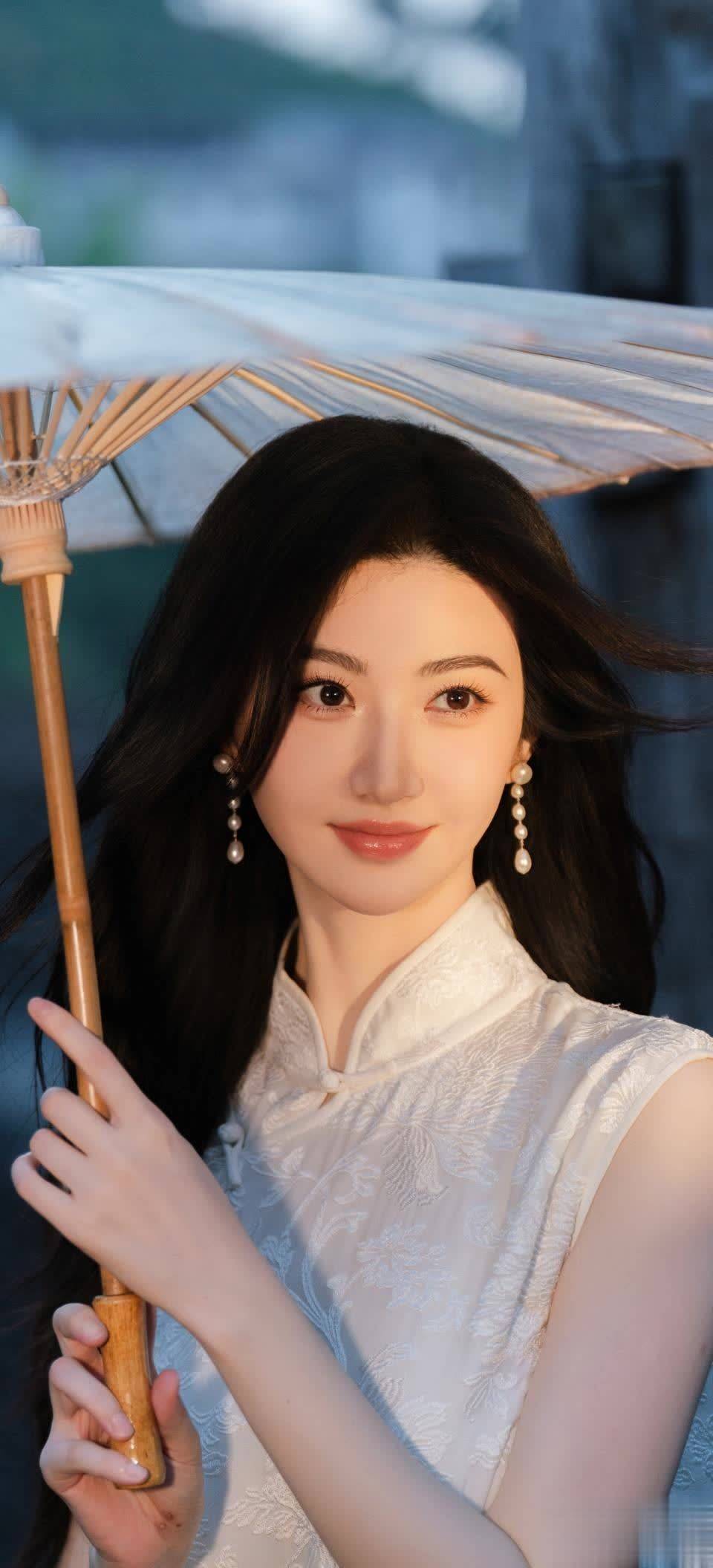 景甜侧身而立,一袭白色无袖上衣勾勒出完美身形曲线,衣身上的精致花纹平添几分雅致。她手持传统油纸伞,乌黑长发自然垂落肩头,珍珠耳饰在光影间摇曳生辉。这张照片捕捉到了她最恬静的瞬间,仿佛时光在这一刻为她停留。第二张:笑靥如花,典雅不凡