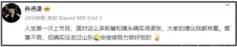 同时,孙丞潇的心脏也很强大,面对任何质疑的时候没有退缩,诸如“吃软饭”、“蹭热度”等质疑都一笑而过,用实际行动证明自己,而不是靠口头的承诺让大家看见他。