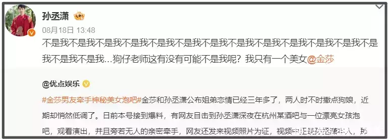 但在2025年还是有了危机,孙丞潇被曝“酒吧牵手”。娱记拍到神似孙丞潇的男子深夜在杭州某酒吧与一位漂亮女孩泡吧,俩人还亲密牵手。随后,孙丞潇转发否认是视频中的男子,并艾特金莎承诺“我只有一个美女”。金莎也积极转发互动,否认视频中的男子是男友。