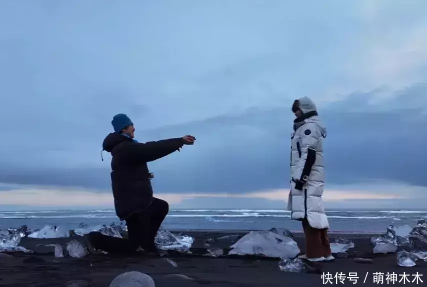 从两人穿搭来看,这场求婚还是比较随性,孙丞潇黑色羽绒服搭蓝色帽子,金莎银色羽绒服、灰色帽子搭红裤子,也算是“红蓝CP色”了。而他们选择的求婚地点也有美好的寓意,“钻石沙滩”象征爱情像钻石和冰川一样永恒。